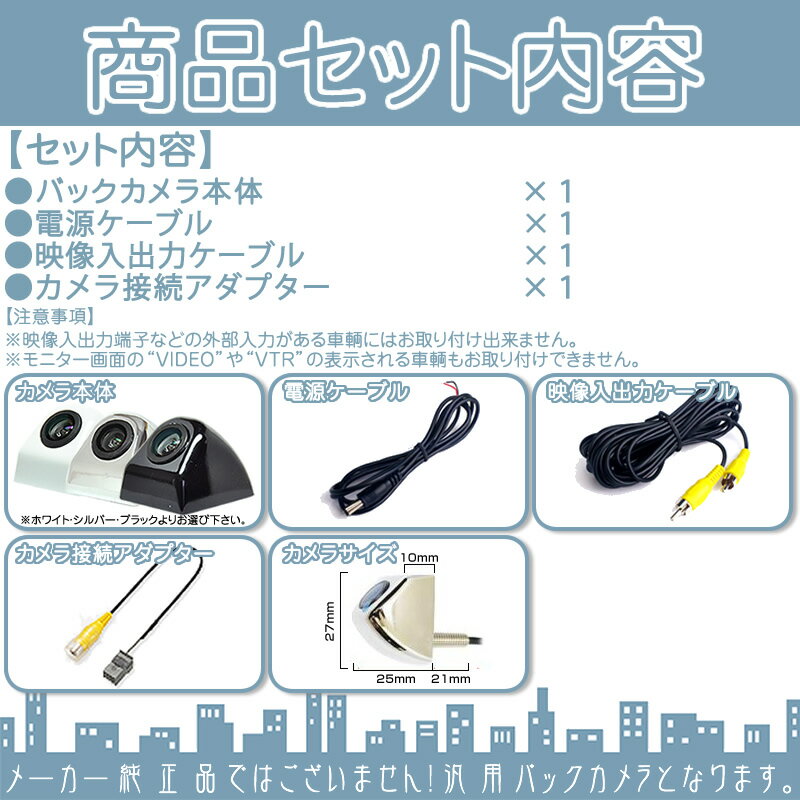 ◆商品仕様 外観 角型 固定方法 ボルト固定タイプ センサー CMOS 画素数 628pix×582pix(32万画素) 視野角 水平 150° / 垂直 100 °/ 対角 170° 出力映像 鏡像 ガイドライン 有or無し 映像出力端子 RCA 定格電圧 DC12V 消費電流 100mA 本体サイズ 横 25mm × 高 25mm × 奥行 27mm 電源ケーブルの長さ 約150cm 映像ケーブル長さ 約500cm ◆付属品 ・バックカメラ本体 × 1 ・電源・映像ケーブル × 1 ・固定用両面テープ × 1 ・固定用ナット × 1 ・映像出力変換アダプター × 1 ◆注意事項 ※必ずサイズ・形状・適合等をご確認の上、ご入札・ご購入ください。