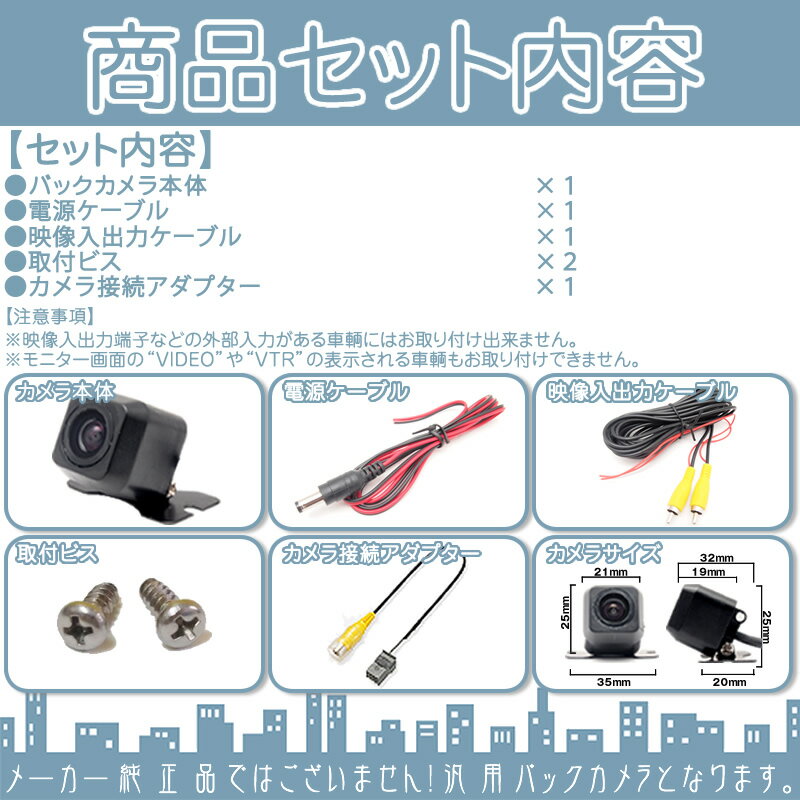 ◆商品仕様 外観 角型 固定方法 ネジ固定 or 両面テープ固定(付属しません) センサー CCD 画素数 628pix×582pix(36万画素) 視野角 水平 150° / 垂直 100 °/ 対角 170° 出力映像 鏡像 ガイドライン 有or無し 映像出力端子 RCA 定格電圧 DC12V 消費電流 70mA 本体サイズ(最大) 横 35mm × 高 25mm × 奥行 32mm 電源ケーブルの長さ 約200cm 映像ケーブル長さ 約500cm ◆付属品 ・バックカメラ本体 × 1 ・電源ケーブル × 1 ・映像ケーブル × 1 ・映像出力変換アダプター × 1 ◆注意事項 ※必ずサイズ・形状・適合等をご確認の上、ご入札・ご購入ください。